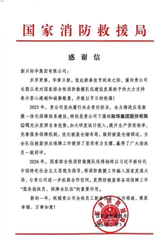 应急管理部国家消防救援局向新兴际华集团发来感谢信感谢新兴际华集团有限公司对中国应急事业做出的巨大贡献。新兴际华集团有限公司市场总监杨贺雄介绍新兴际华集团是国务院国资委监管的中央企业,是集资产管理、资本运营和生产经营于一体的大型国有独资公司。集团总部位于北京CBD财富金融中心。新兴际华集团聚焦冶金、轻纺、装备、应急、医药五大主业,资产经营管理、现代供应链物流、现代商业服务三大专业化领域,以及一个产业投资平台。主要产品及业务包括球离心球墨铸铁管及管件、钢格板、钢材、特种钢管、制造用钢、工程机械、纺织品、服装、染整、皮革皮鞋、橡胶制品、特种和专用车辆、油料器材、装具、医药以及商贸服务等。新兴际华集团系国家级创新型企业。是目前综合实力和技术水平位居世界前茅、产量销量居于世界首位的球墨铸铁管生产研发基地;拥有世界领先的后勤军需品、职业装、职业鞋靴生产研发基地,国内领先的钢格板、高端纺织品生产研发基地。拥有军需装备出口权。是国内首家获批将应急产业作为主业发展的中央企业。拥有国家级企业技术中心、军需品检中心、博士后工作站。“新兴”和“际华”两大主品牌均跻身亚洲品牌五百强。